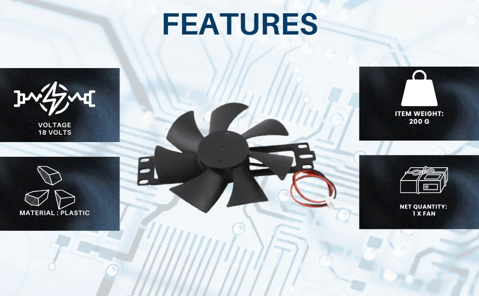 Product Description FEATURES: Induction Cooker Fan Voltage : DV 18V. Sweep Diameter : 10.8cm/ 4.2″Size : 14.2 x 9.8 x 2cm/ 5.5″ x 4″ x 0.8″ (L*W*T) Material : Plastic, Electronic Induction cooker Part Color : Black Net Weight : 67g Package Included : 1 x Induction Cooker Fan